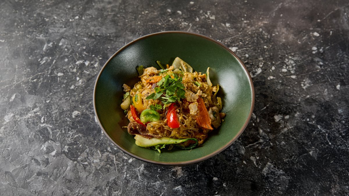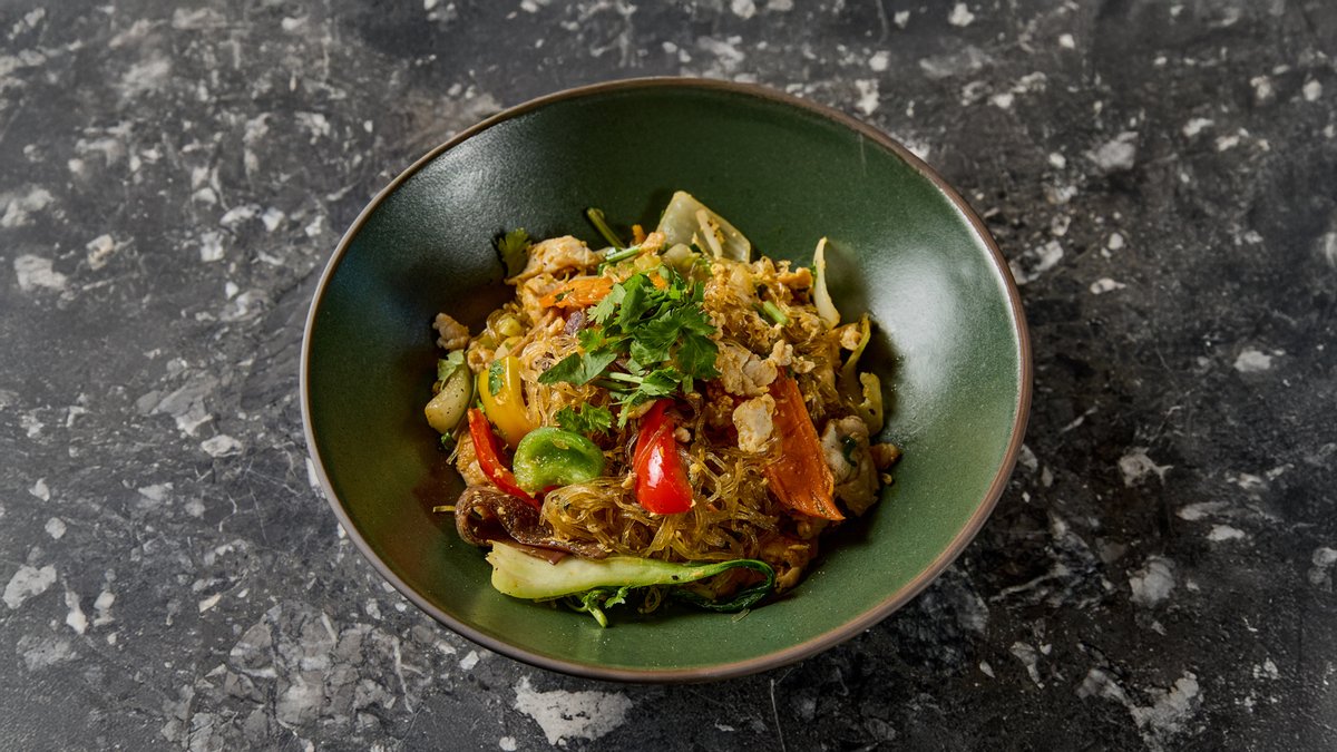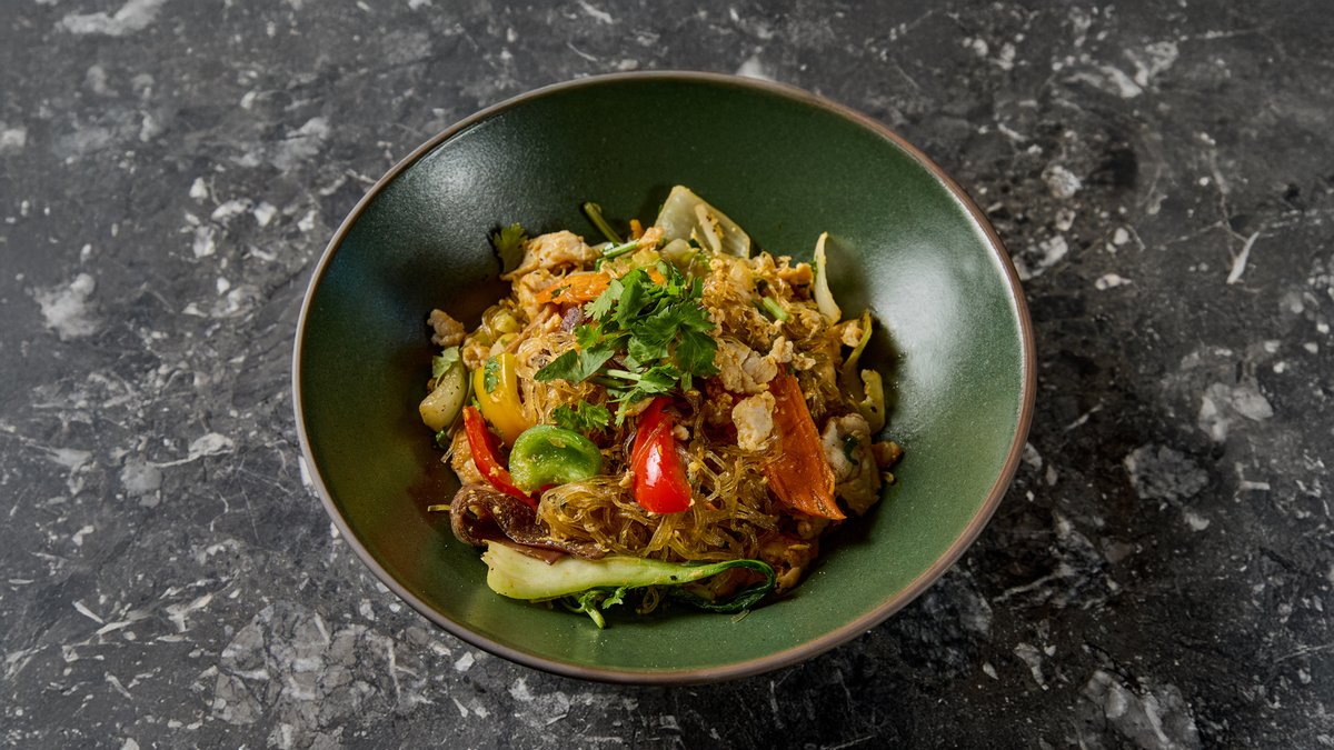 Rizstészta, perilla, thai bazsalikom, menta, koriander, répa, karalábé, kígyóuborka, saláta – seafood szósszal tálalva