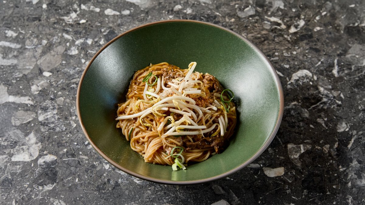 Rizstészta, shiitake gomba, pak choi, babcsíra, sárgarépa, szójaszósz, pirított hagyma, tojás, földimogyoró