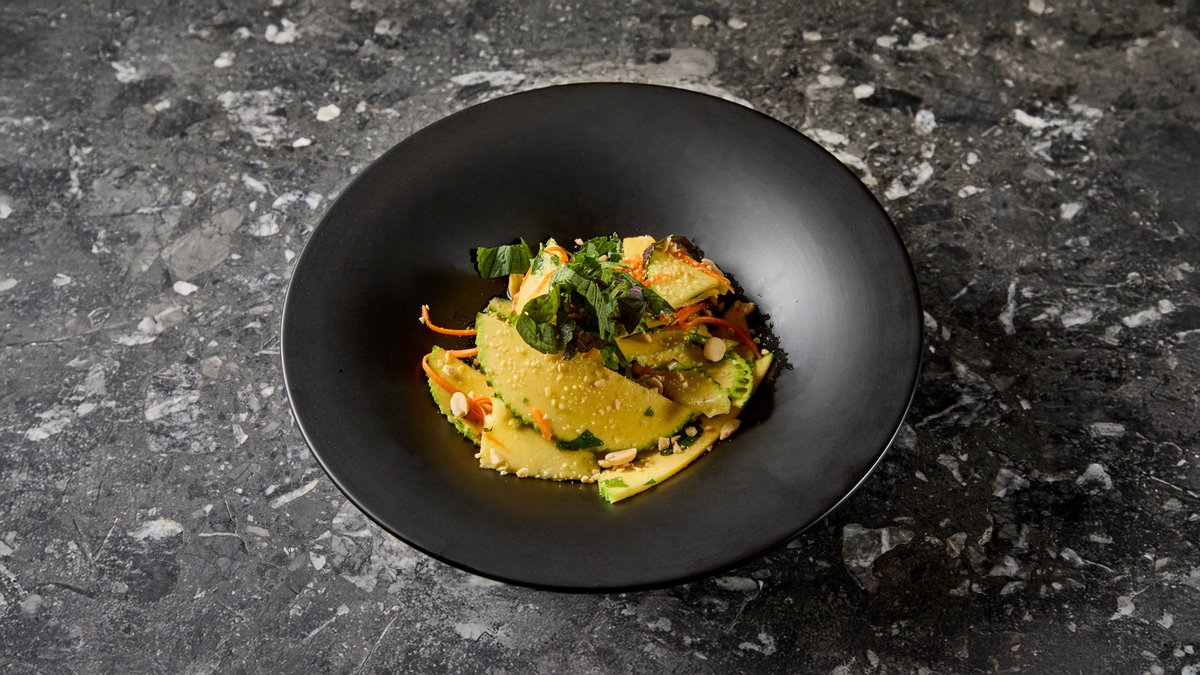 Rizstészta, perilla, thai bazsalikom, menta, koriander, répa, karalábé, kígyóuborka, saláta – mangószósszal tálalva