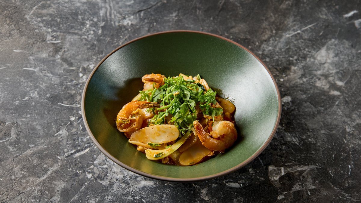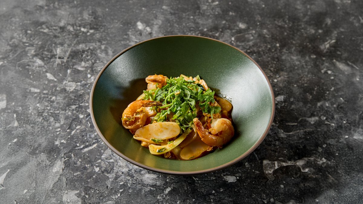 pak choi, shiitake, répa, babcsíra, pirított mogyoróhagyma, osztrigaszósz, tigrisrák