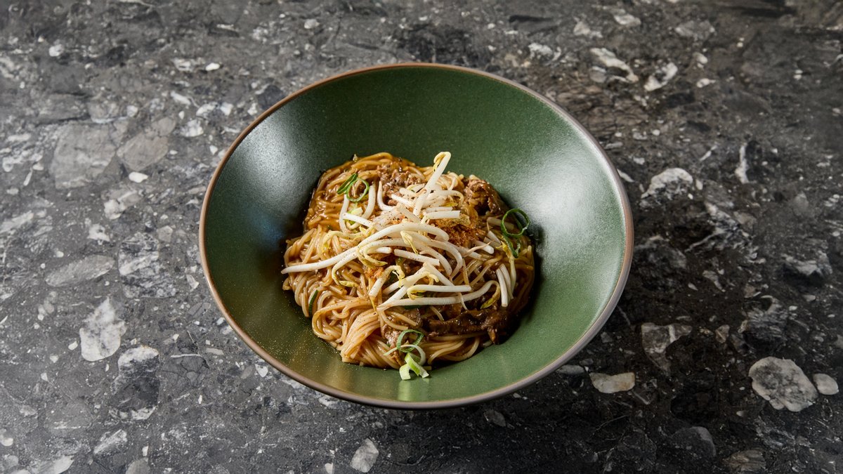 Rizstészta, shiitake gomba, pak choi, babcsíra, sárgarépa, osztrigaszósz, szójaszósz, pirított hagyma, tojás, földimogyoró, marhahús