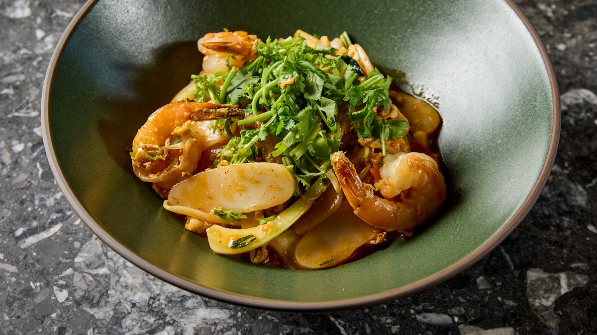Rizstészta, babcsíra, koriander, újhagyma, tigrisrák, tintahal