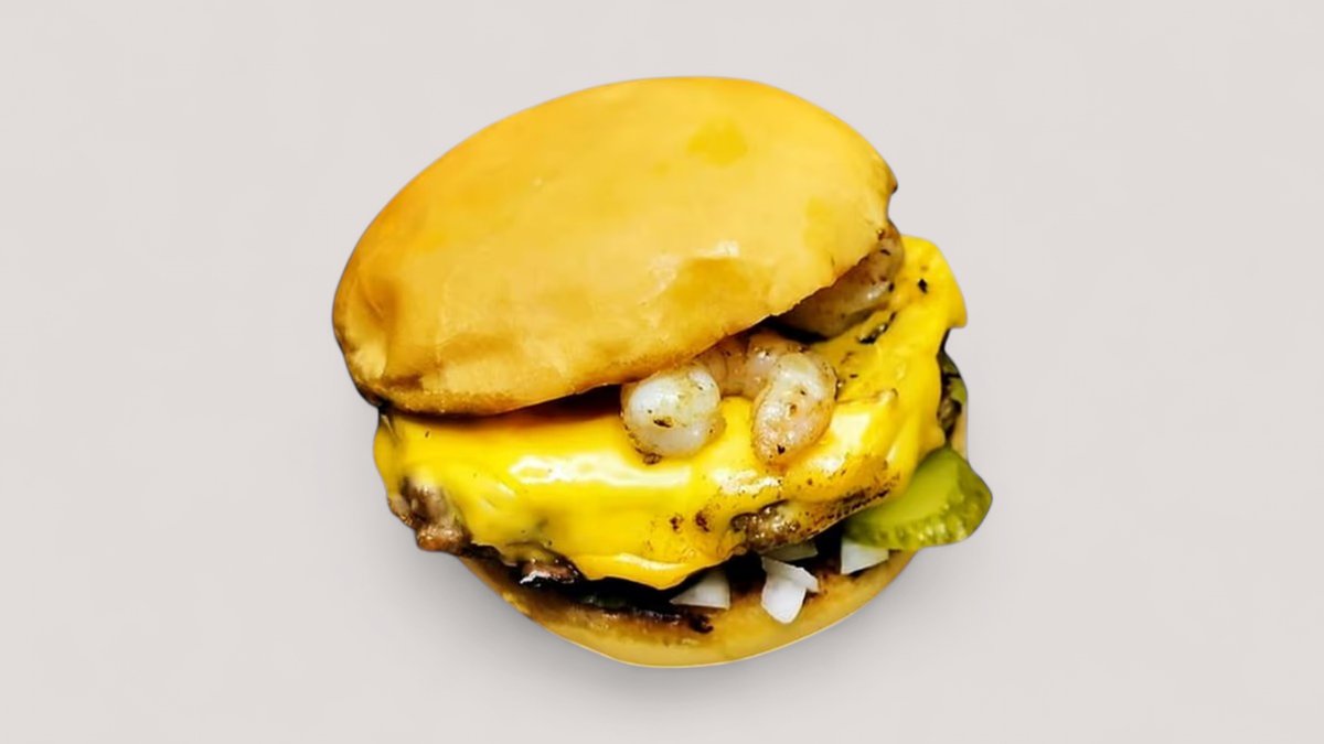 Garnélarák , marhahús, cheddar, house szósz, uborka, hagyma.