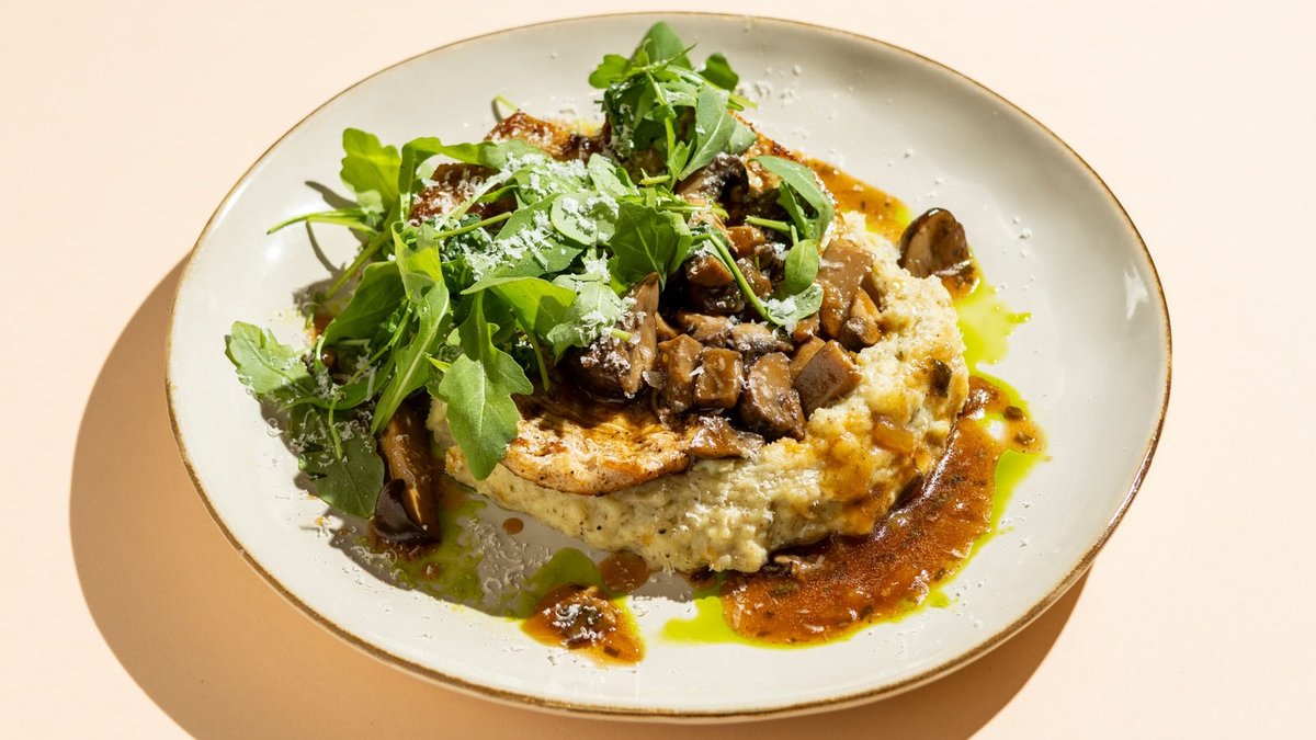 Krémes szarvasgombás burgonyapürévél, sült erdei gombákkal, rukkolával és parmezánnal