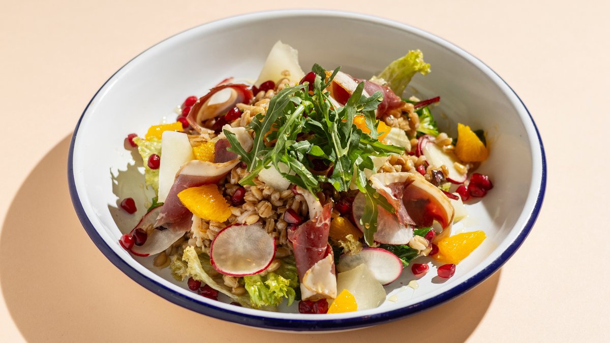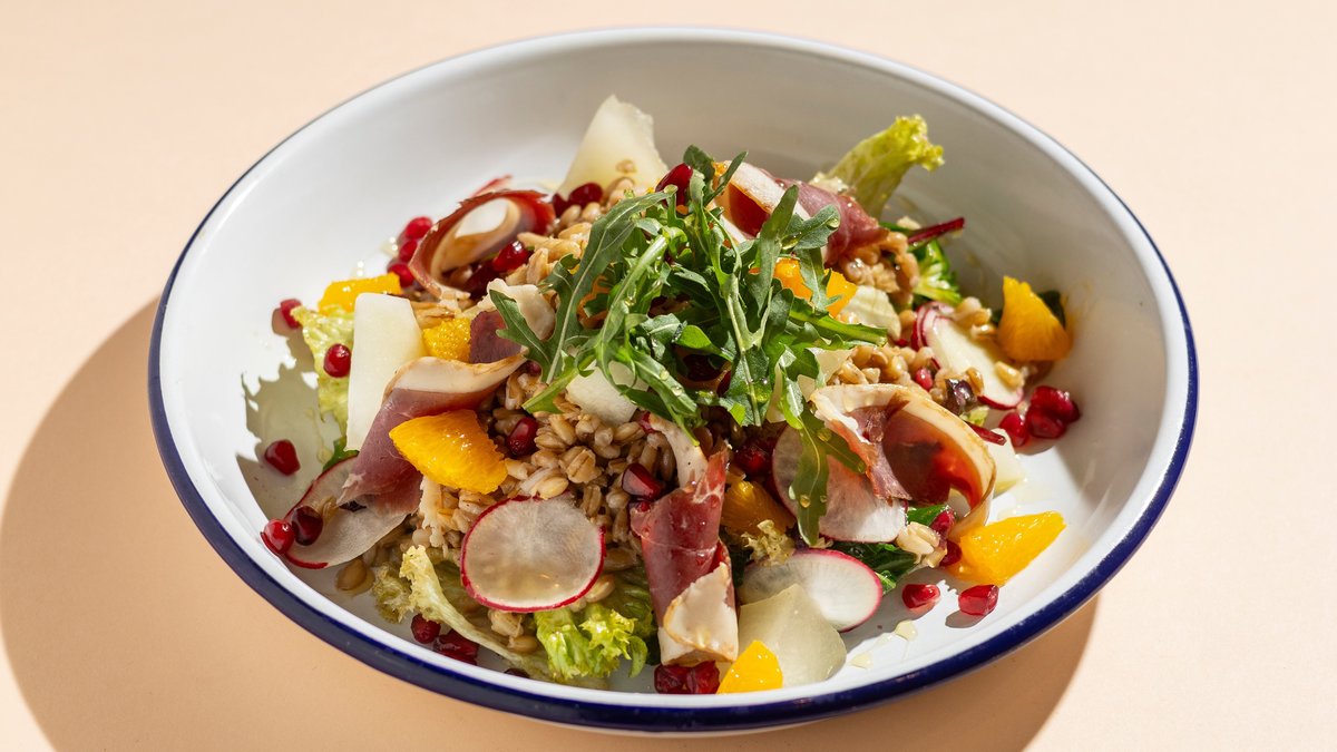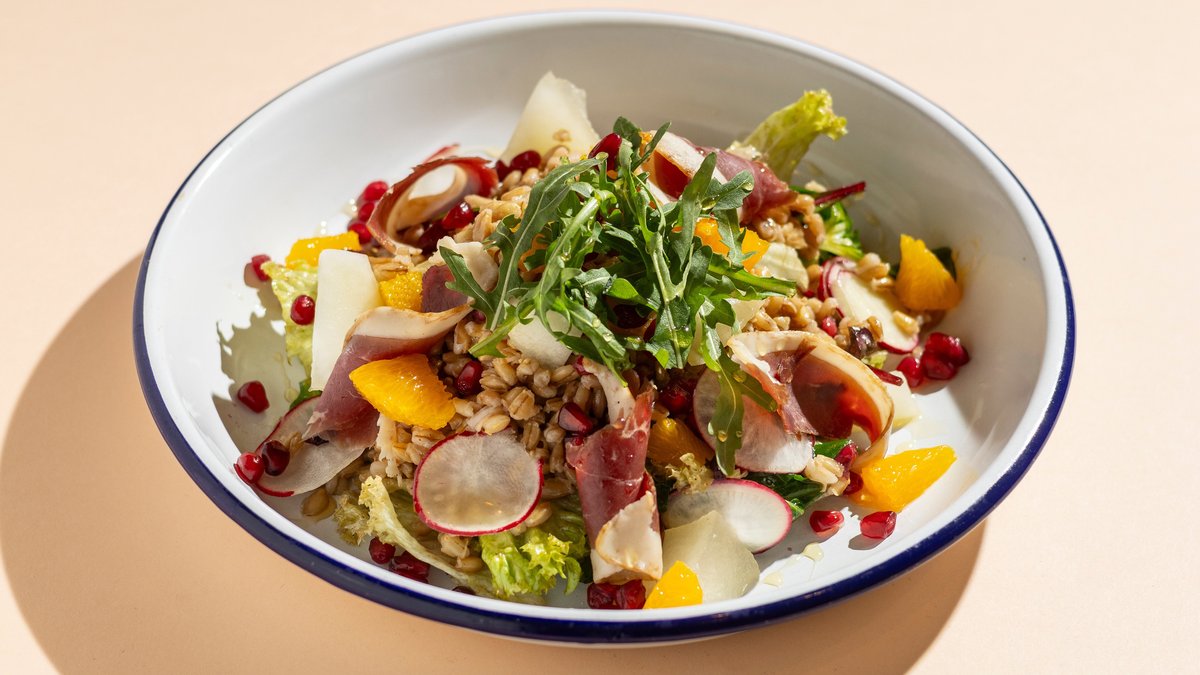 friss salátával, árpával, sárgadinnyével, gránátalmával & mézes-narancsos dresszinggel