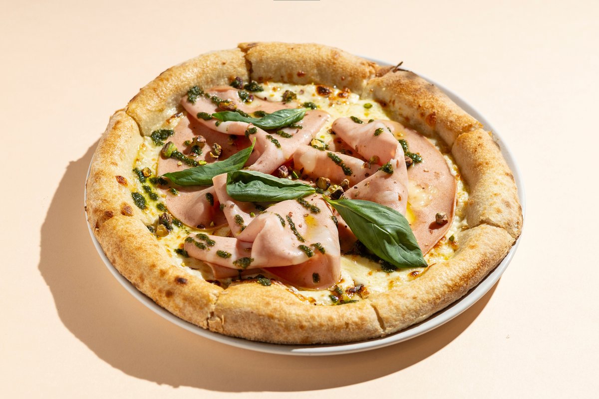 besamellel, füstölt provolone sajttal, parmezánnal, mortadellával & pisztácia pesztóval