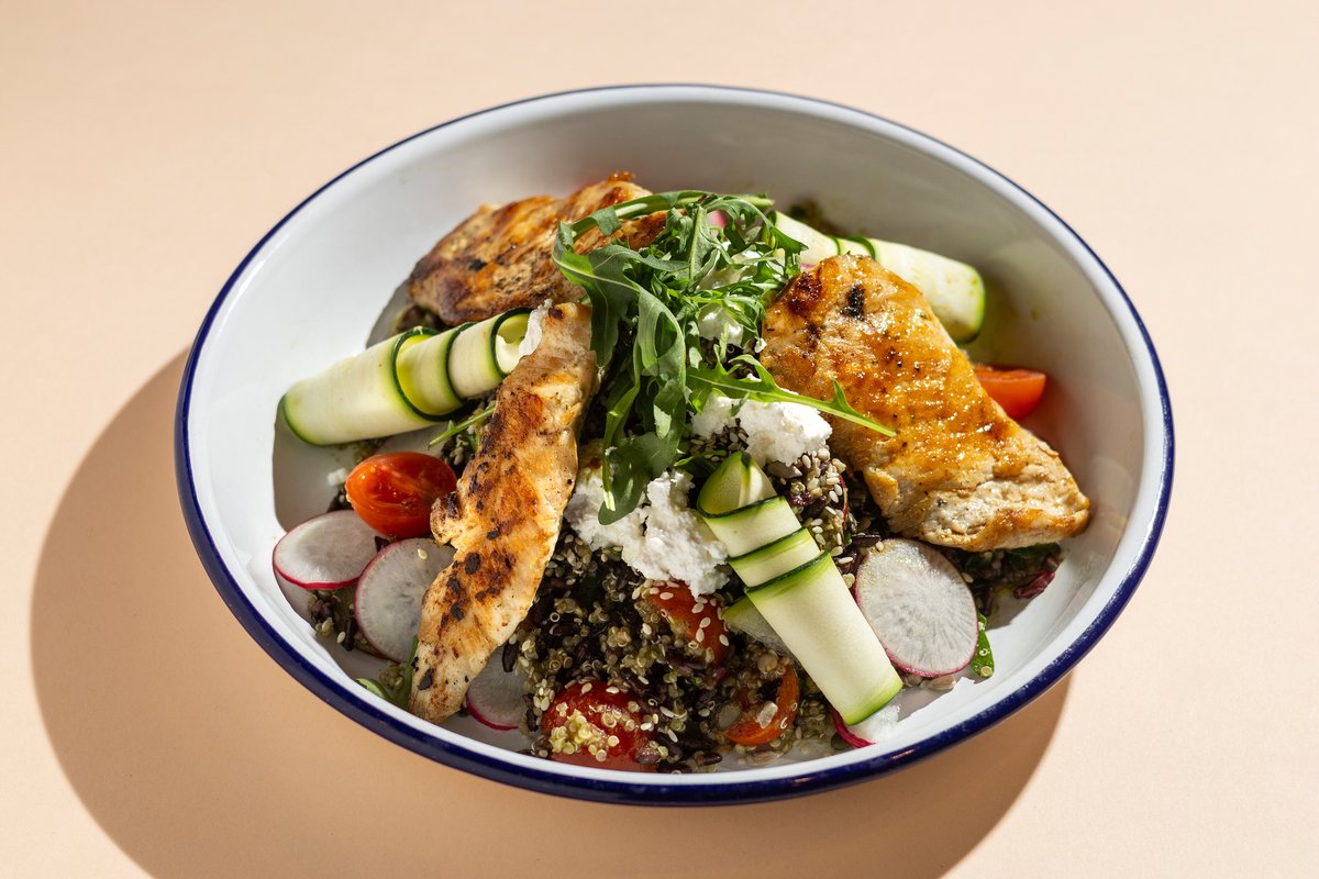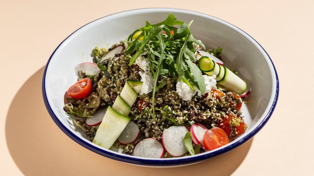 quinoával, fekete rizzsel, cukkínivel, retekkel, csicseriborsóval, radicchioval, fetasajttal, zöld dresszinggel & pirított magvakkal