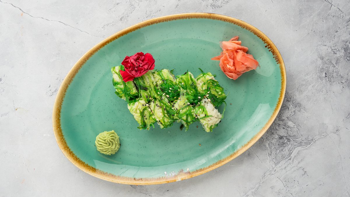 3pcs avocado maki, 3pcs tamago maki, 5pcs vegetarian futomaki, 2pcs vega gyoza, wakame salad