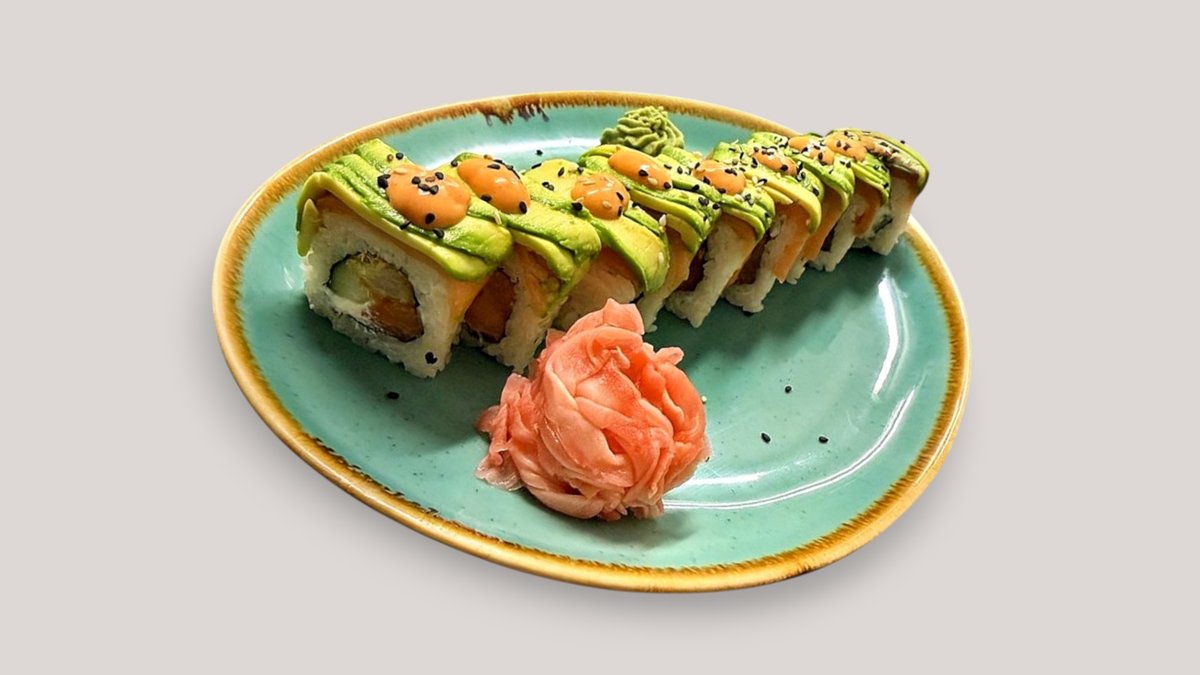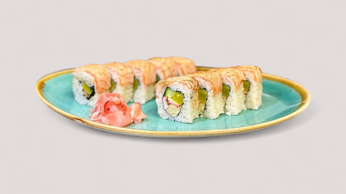(Creamcheese, cucumber, panko shrimp, salmon, avocado-smoked salmon topping) with spicy mayo sauce
