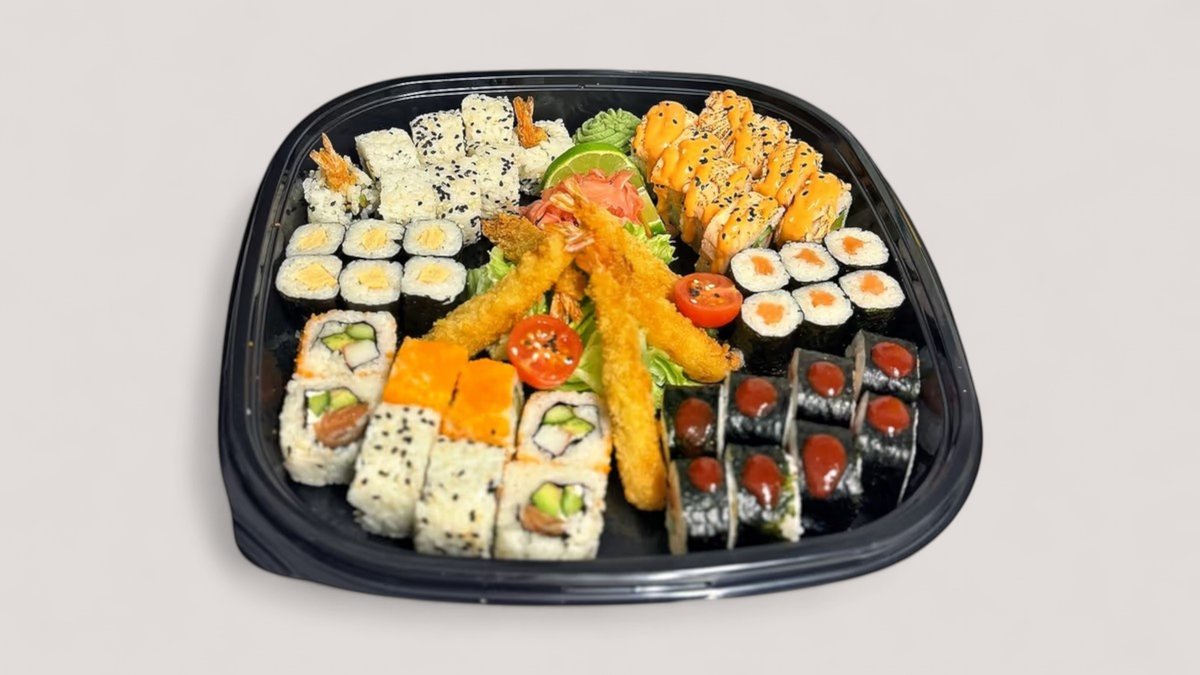 9pcs Special Tempura roll, 6pcs cucumber maki, 6pcs cucumber maki, 6pcs avocado maki, 6pcs salmon maki, 8pcs salmon avocado uramaki, 8pcs tempura shrimp-avocado uramaki, 4pcs salmon nigiri, 4pcs ebi shrimp nigiri, 4pcs tuna nigiri