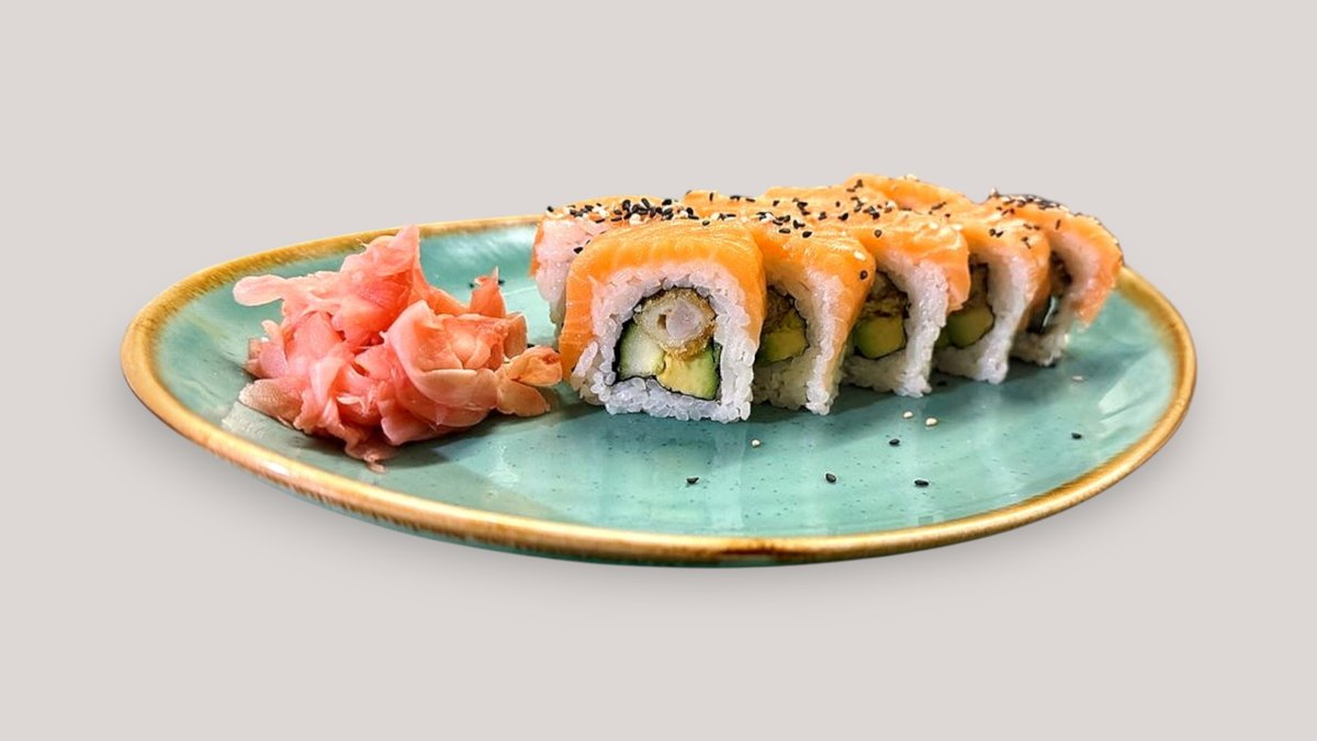 (tempura salmon, cucumber, avocado) with teriyaki and tobico