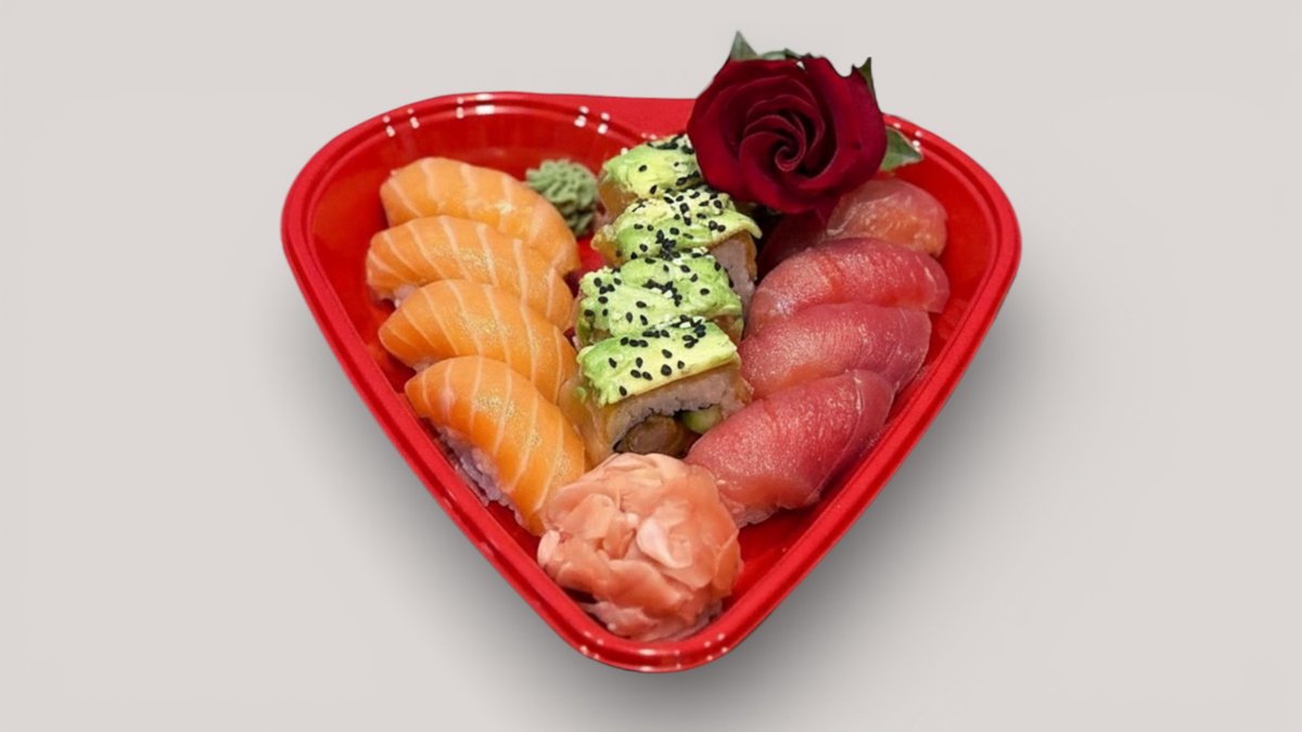 Special box for valentine’s day. 4 pcs of salmon nigiri, 4 pcs of tuna nigiri, 4 pcs of Subarashii roll