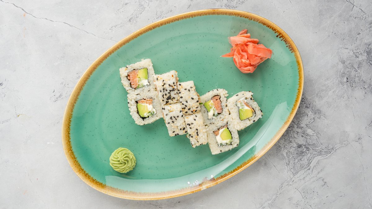 (cream cheese, avocado, cucumbers, smoked salmon) with sesame