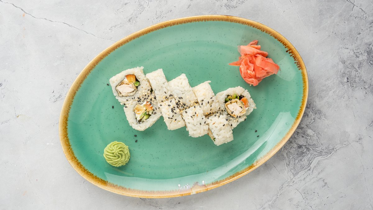 (teriyaki chicken, cream cheese, cucumber, paprika) with teriyaki sauce and sesame