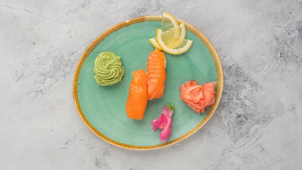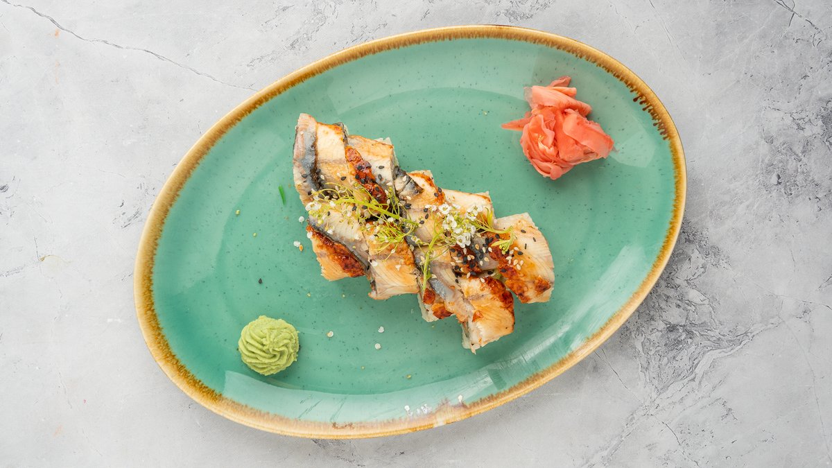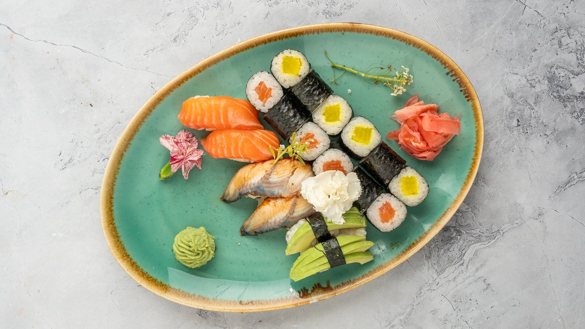 6 salmon maki, 6 radish maki, 2 salmon nigiri, 2 unagi nigiri, 2 avocado nigiri