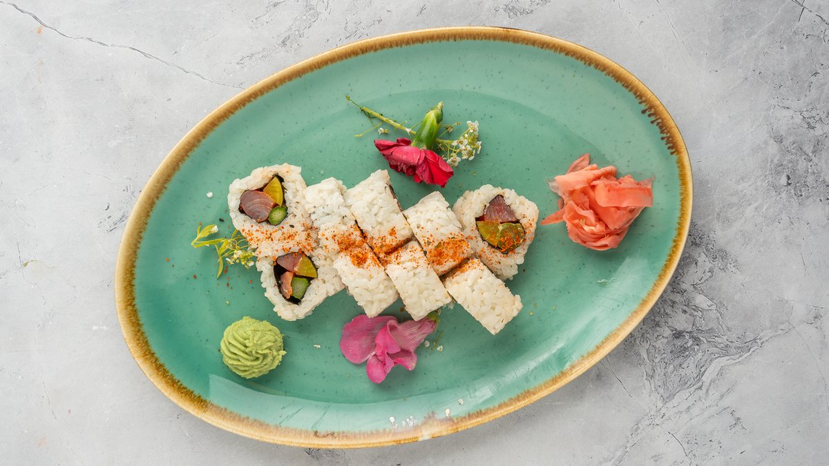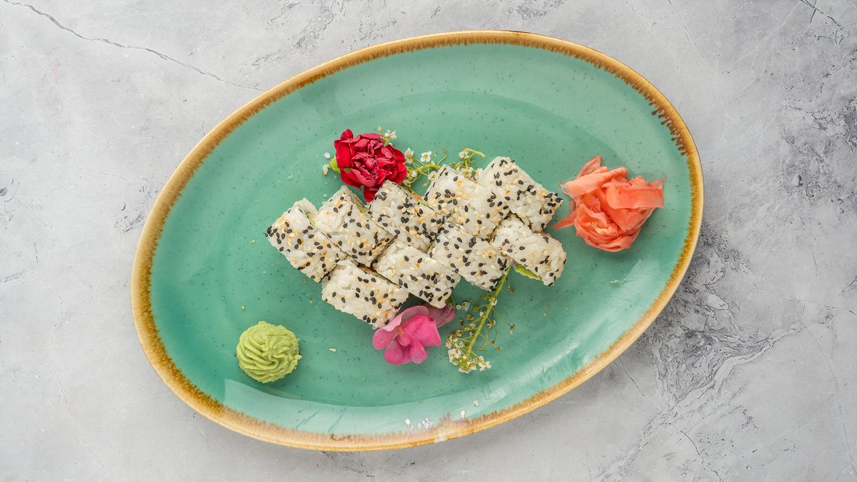 3pcs avocado maki, 3pcs tamago maki, 5pcs vegetarian futomaki, 2pcs vega gyoza, wakame salad, mochi
