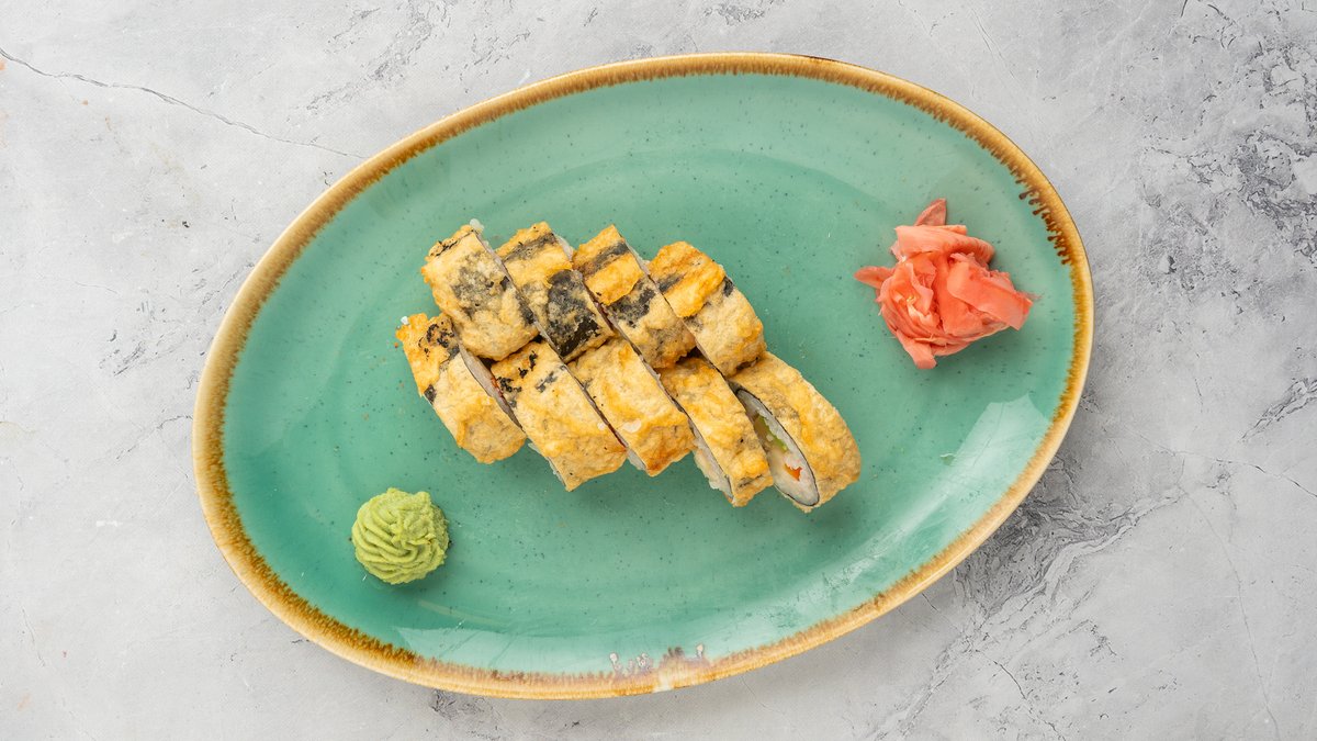 (tempura salmon, cucumber, asparagus) with teriyaki and tobico