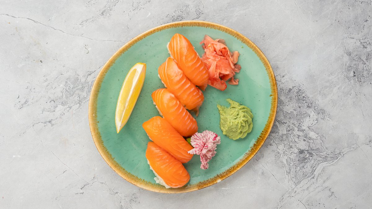 2 salmon nigiri, 2 ebi shrimp nigiri, 4 salmon-avocado uramaki