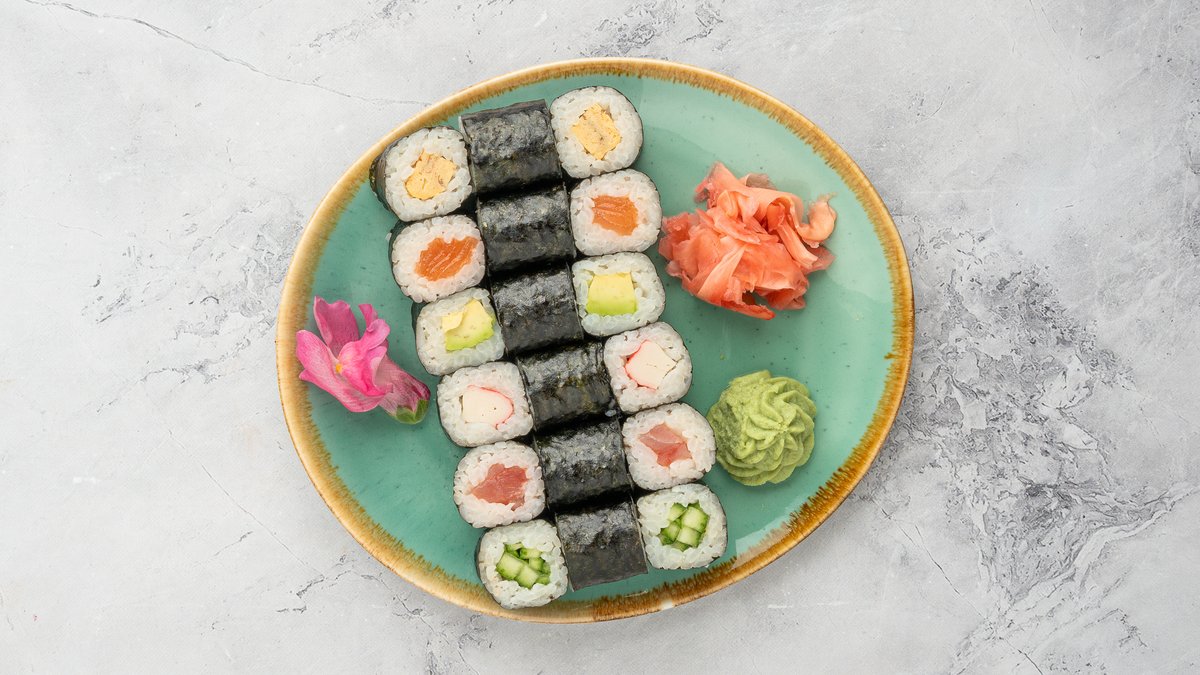 3 avo maki, 3 tempura shrimp maki, 3 surimi maki, 3 tamago maki, 3 salmon maki, 3 smoked tofu maki