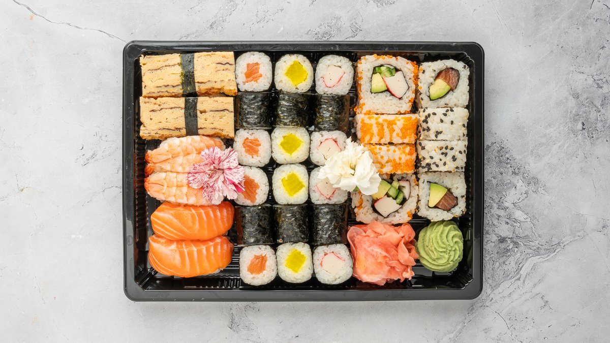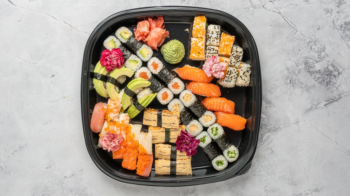 9pcs Special Tempura roll, 6pcs cucumber maki, 6pcs cucumber maki, 6pcs avocado maki, 6pcs salmon maki, 8pcs salmon avocado uramaki, 8pcs tempura shrimp-avocado uramaki, 4pcs salmon nigiri, 4pcs ebi shrimp nigiri, 4pcs tuna nigiri