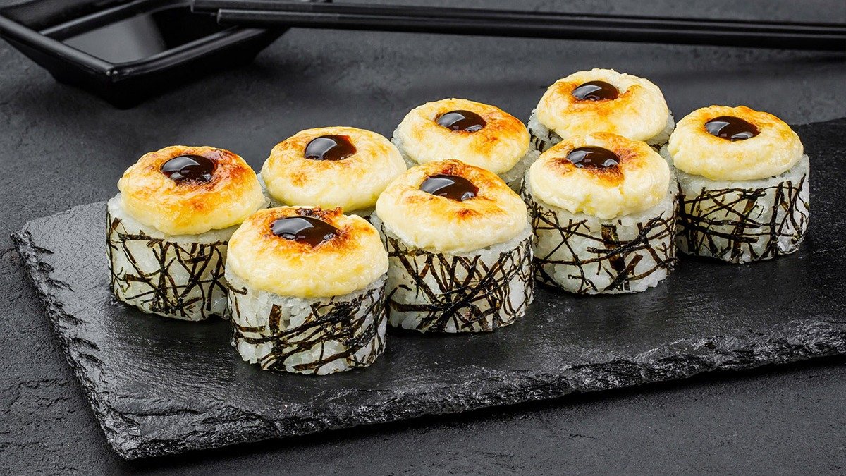 Rizs, lazac, uborka, jégsaláta, avokádó, sajt, tempura liszt, panko morzsa, mogyorószósz, majonéz, sriracha szósz, szezámmag, zöldhagyma, nori