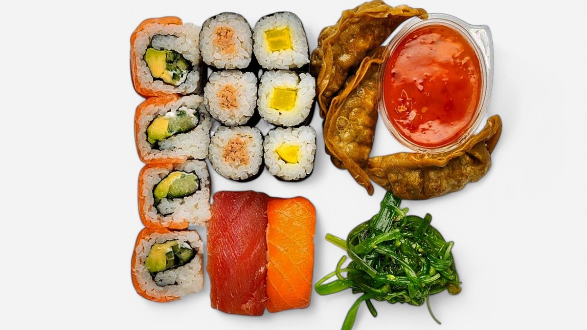 2x lazac nigiri, 4x lazac, avokádó, krémsajt tekercs, 3x takuan maki, 3x tonhalkrém maki, 2x zöldséges gyoza, wakame saláta, édes chili szósz
