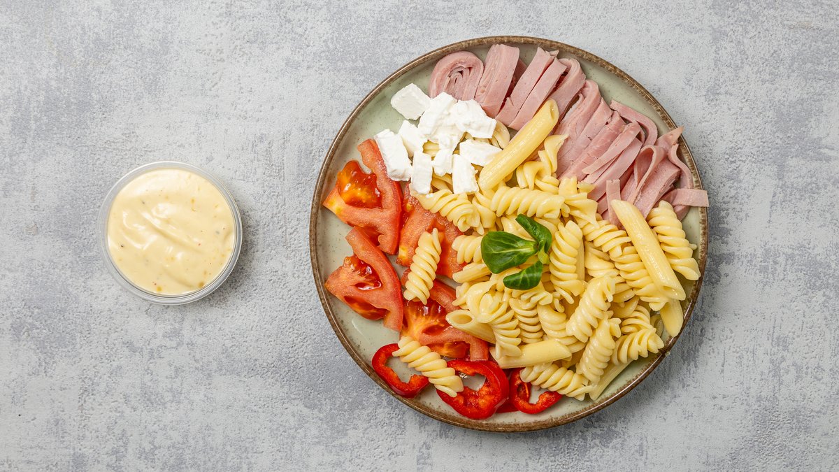 Tejszínes tésztasaláta fűszernövényekkel és sonkával