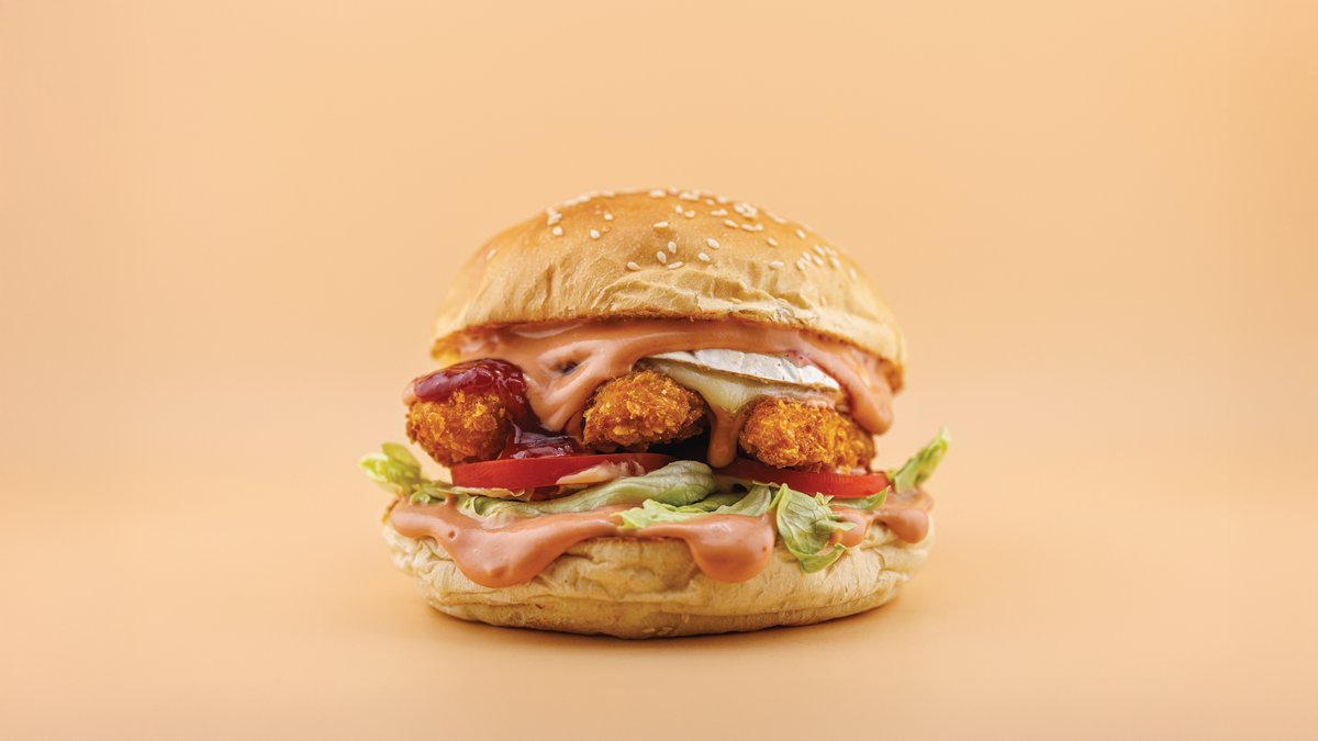 Csirkemell filé ropogós bundában, grillezett francia camembert sajt, házi málnalekvár, kézműves buci, jégsaláta, paradicsom, burger project szósz