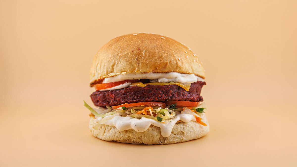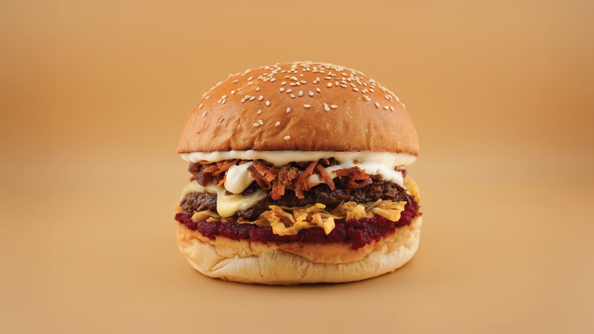 OZY ROOTS - HÓNAP BURGERE | Angus húspogácsa (130g), ementáli sajt, kézműves buci, marinált kelkáposzta, lilahagyma lekvár, vajban pirított répa, házi céklakrém, majonéz