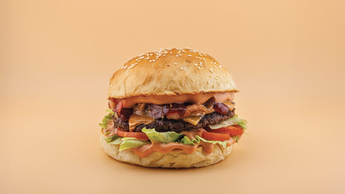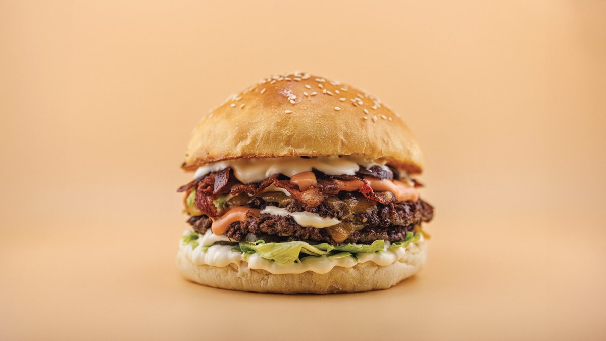 Dupla Angus húspogácsa (2x130g), dupla ír cheddar sajt, kézműves buci, dupla grillezett bacon, jégsaláta, lilahagyma lekvár, választható házi szósz