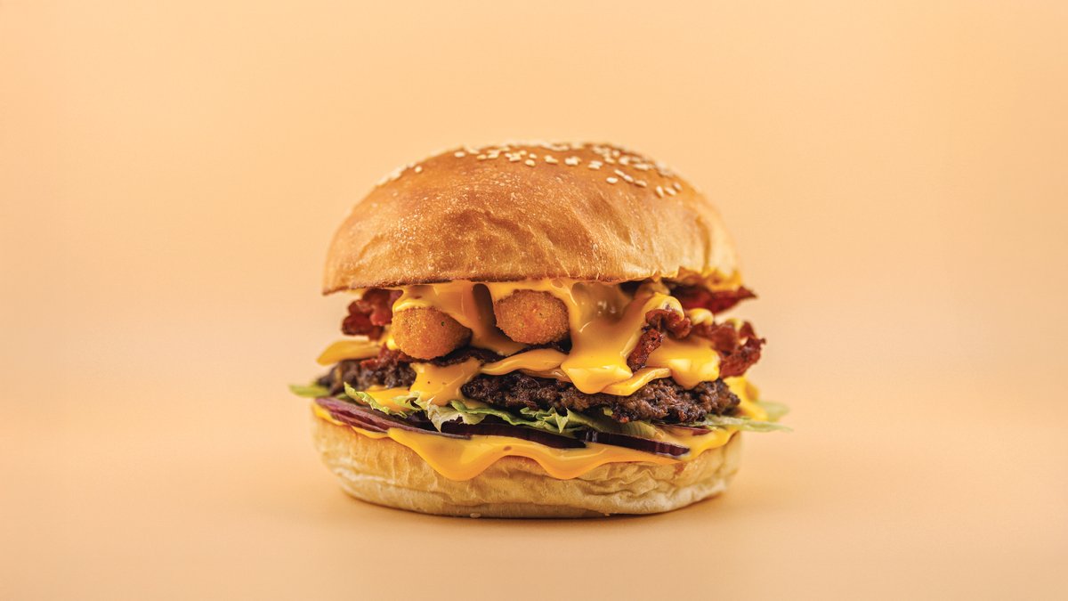 Angus húspogácsa (130g), kézműves buci, ír cheddar sajt, jégsaláta, lilahagyma, grillezett bacon, ropogós mozzarella sajtfalatok, cheddar sajtszósz