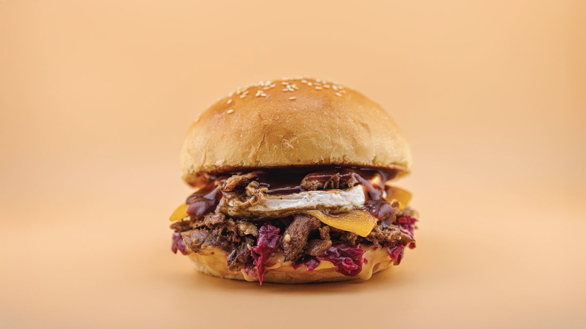 Sous vide tépett kacsa, kézműves buci, ír cheddar sajt, grillezett camembert sajt, almás párolt lilakáposzta, mézes mustáros szósz, BBQ szósz