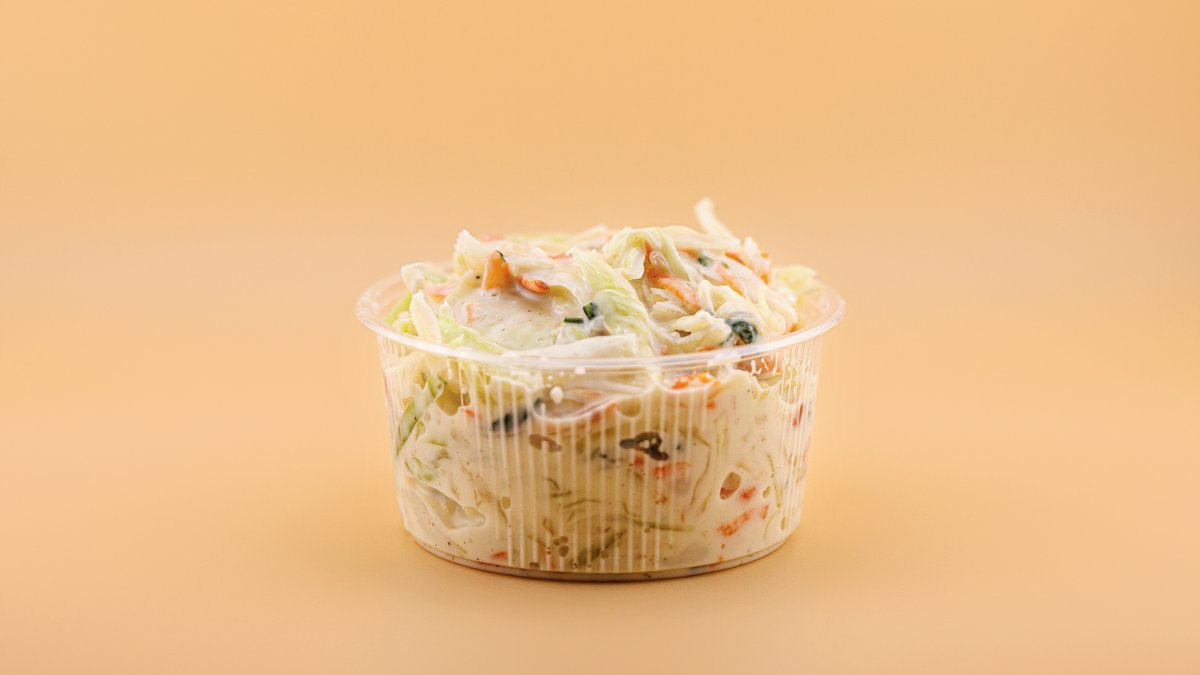 Friss, ropogós házi káposztasaláta enyhén édes, krémes öntettel – a burger tökéletes kísérője.