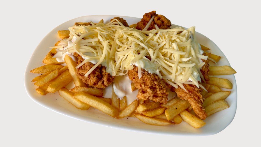 tejfölös alap, csirke, kukorica, tükörtojás, sajt