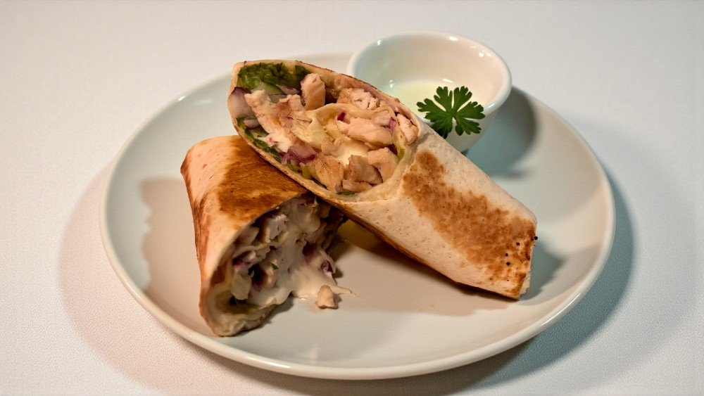 Kiflibe töltött gyros hús, uborka, paradicsom, lilahagyma, kukorica, sajt, tartár