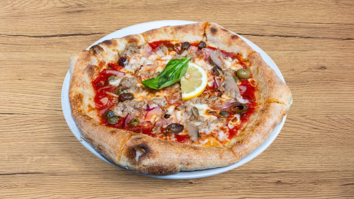 paradicsomszósz, fior di latte, tonhal, lilahagyma, kapribogyó, olívabogyó, citromolaj