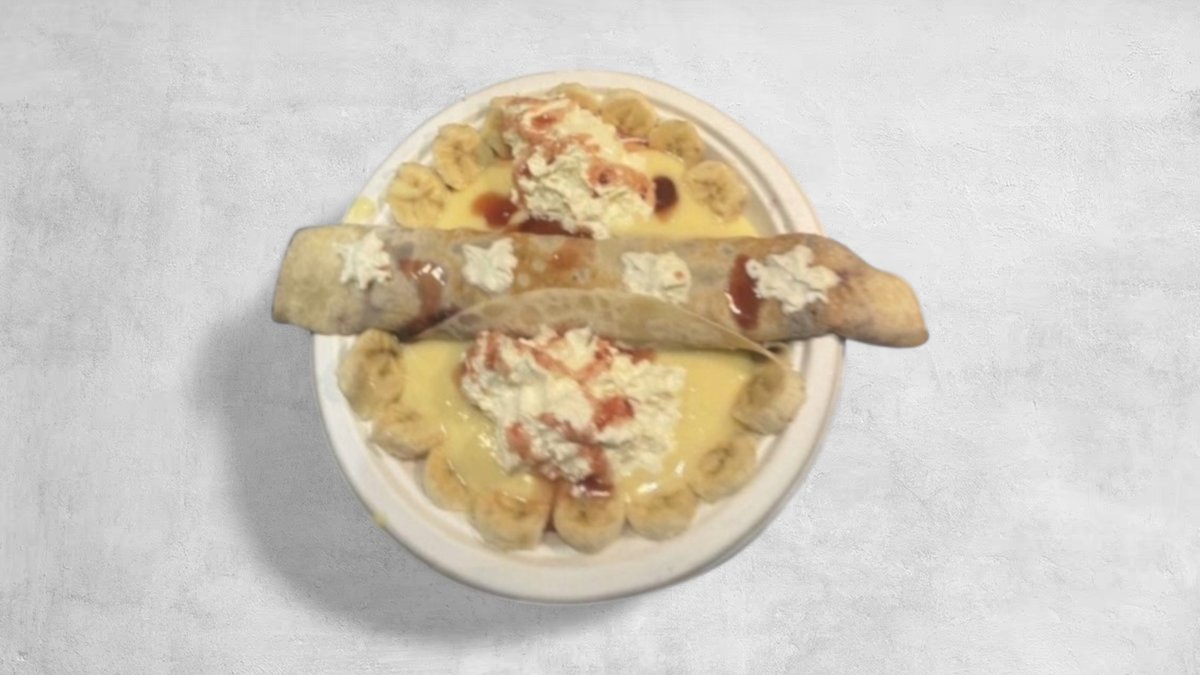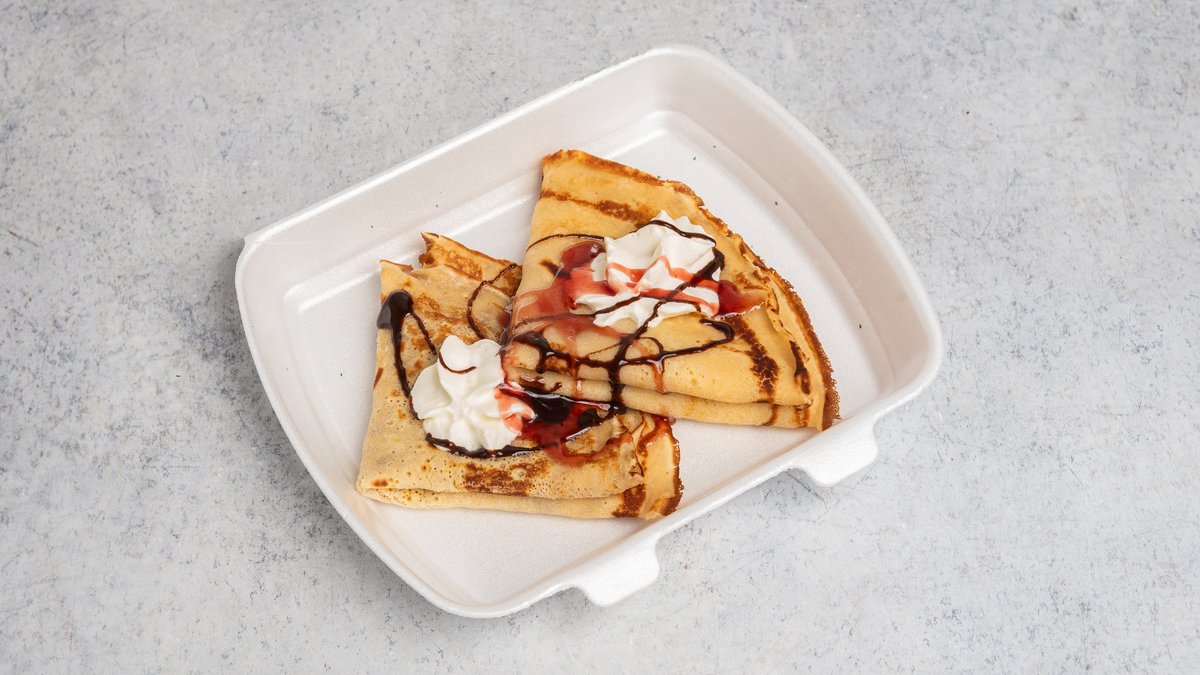 Palacsinta pudinggal, gyümölccsel, csokiöntettel és tejszínhabbal