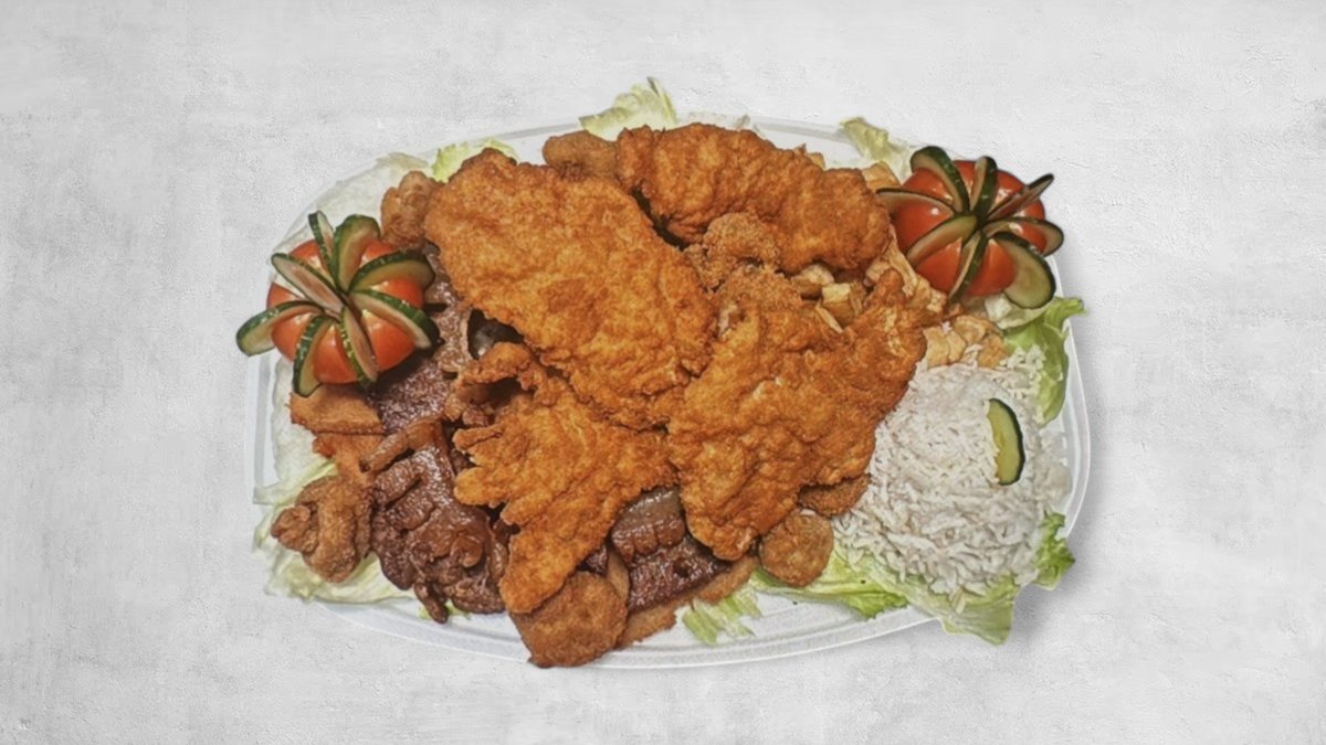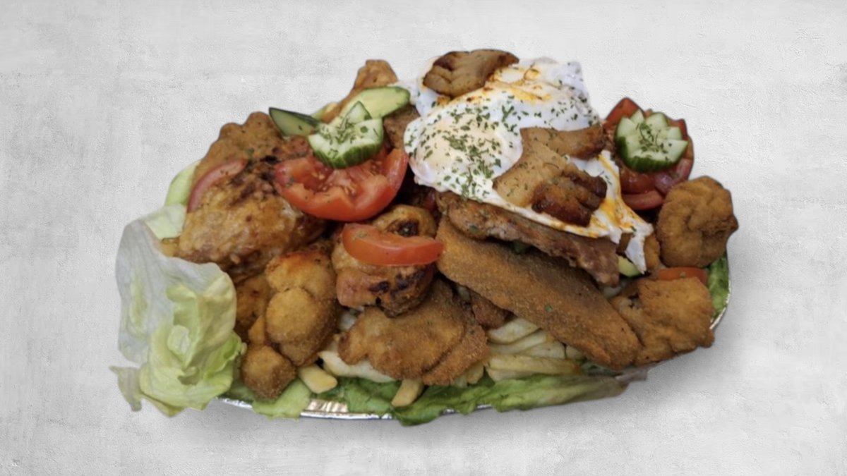 Cordon bleu 6 db, hagymakarika 6 db rántott trappista sajt 6 db, rántott gomba 6 db, cigánypecsenye 6 db, rántott karfiol 6db, rántott csirke mell 6db.