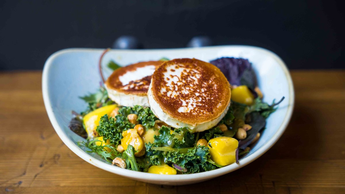 grillezett francia kecske camembert sajt, salátamix, mangó, mogyoró, vinaigrette szósz