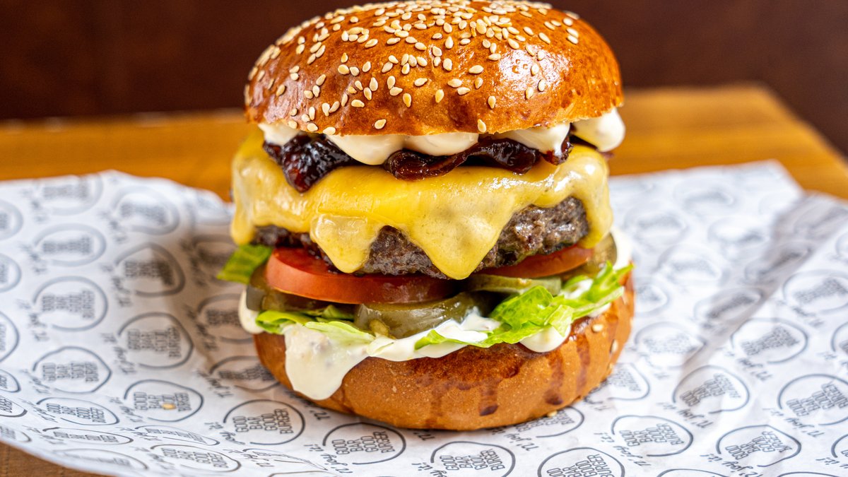 Marhahúspogácsa, sajt, GB szósz, hagymalekvár, füstölt uborka, paradicsom, salátalevél
