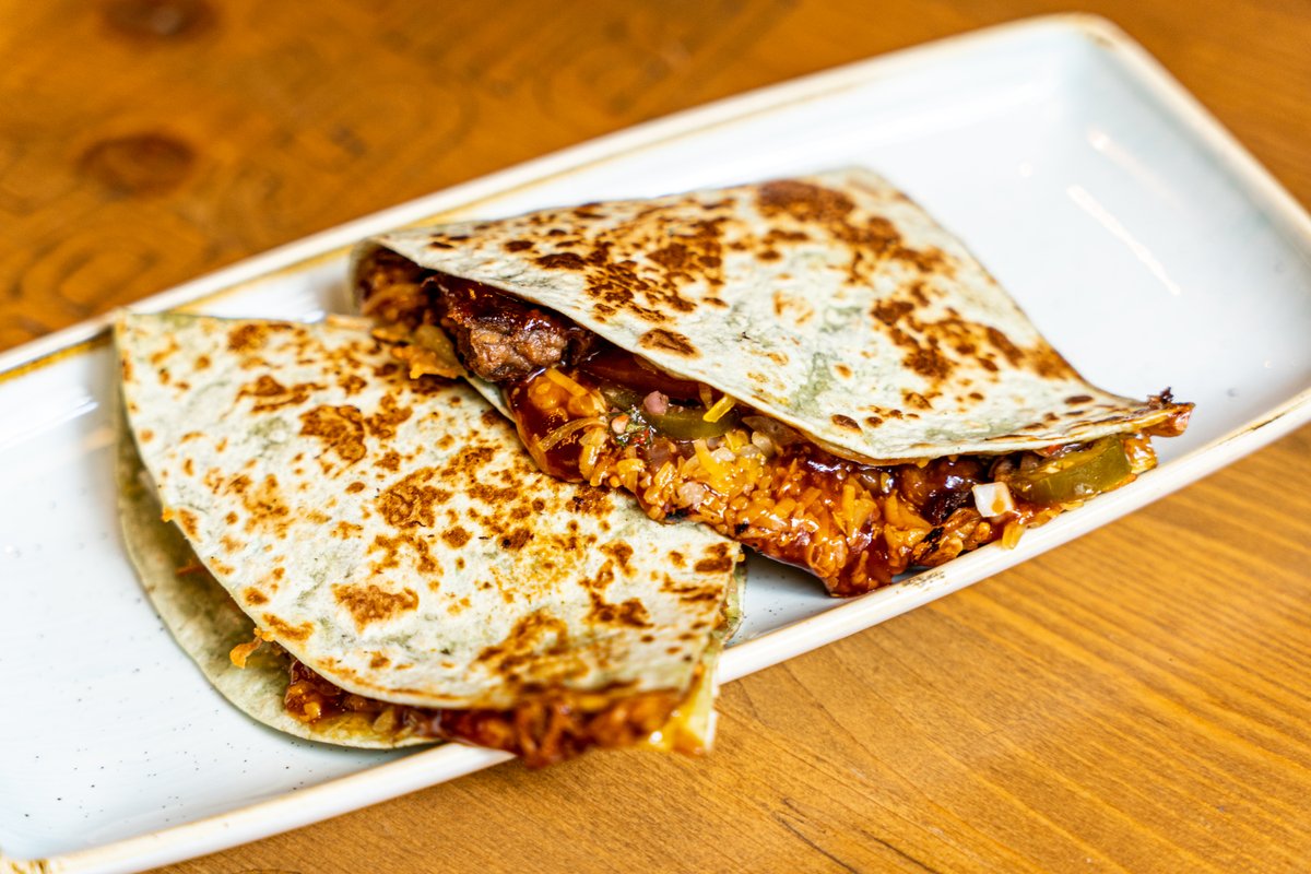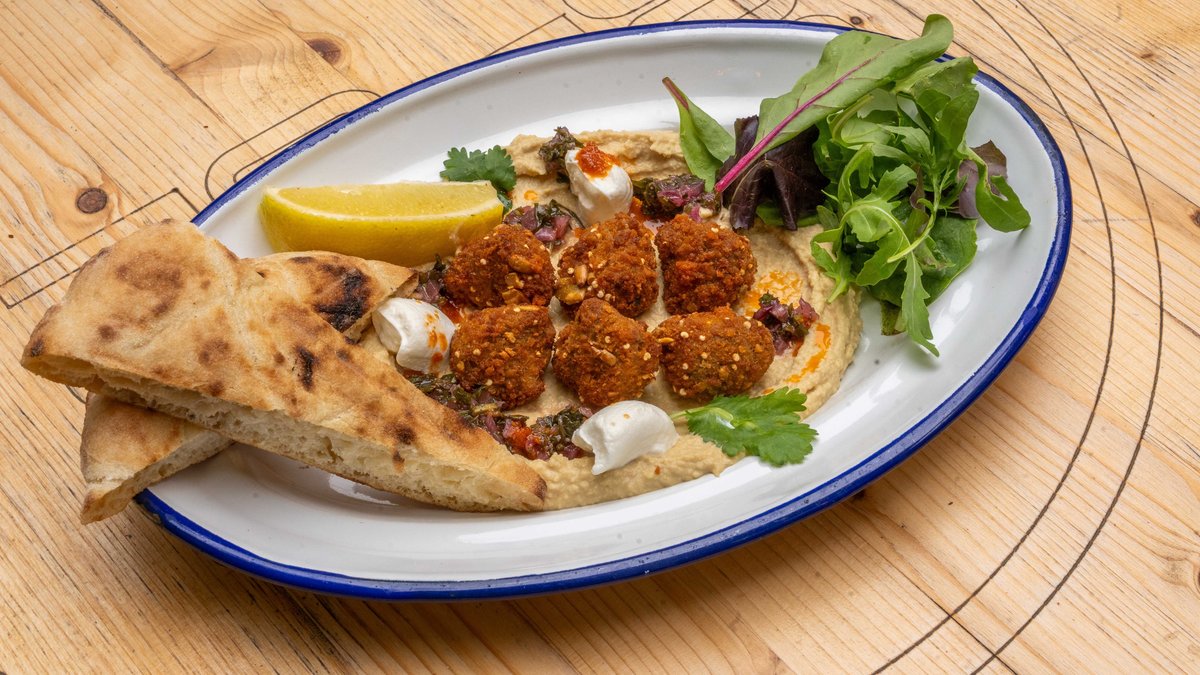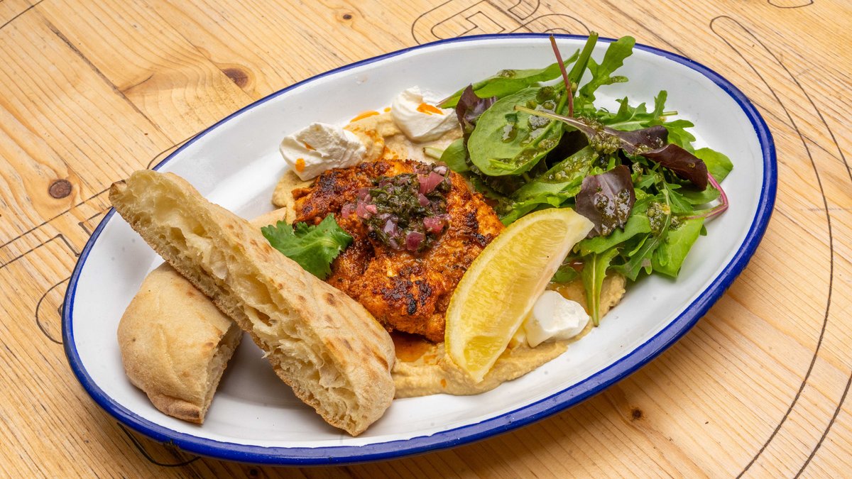 Közel-keleti fűszerezésű csirkemell, humusz, labneh, chimichurri, saláta, pita, citrom.