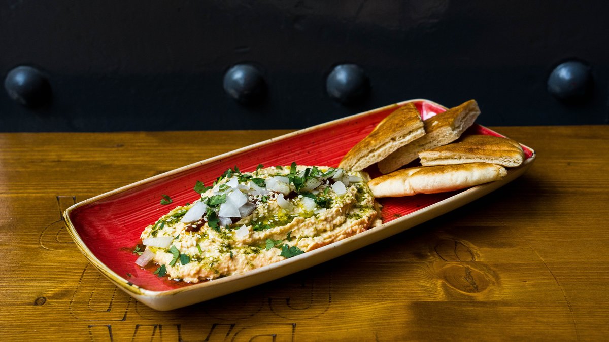 hummus, pita, fehér hagyma, chipotle krém (csípős), mandulás pesto