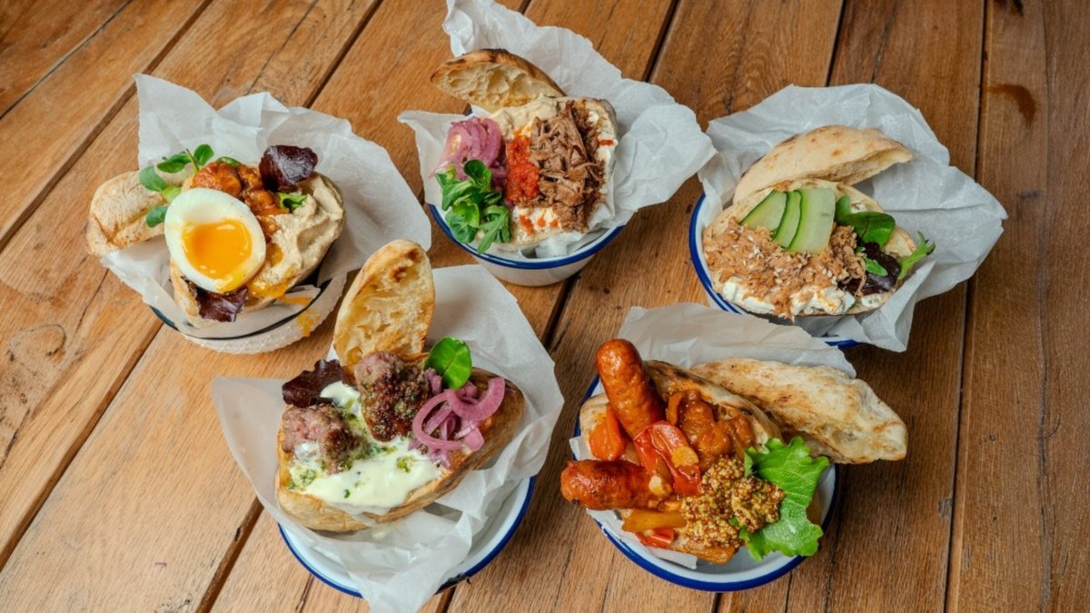 Humusz, labneh, chimichurri, saláta, pita, citrom.
