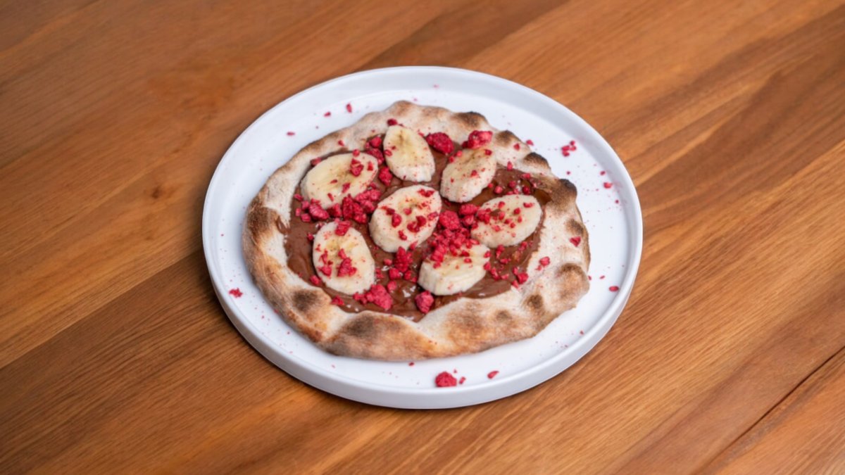 banán szeletekkel és liofolizált málnával. 1 személy számára tökéletes méret.