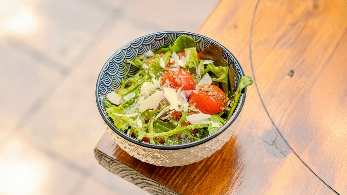 kevert saláta, koktél paradicsom, parmezán, mandulás pesto /mixed salad, cherry tomatoes, parmesan, almond pesto/