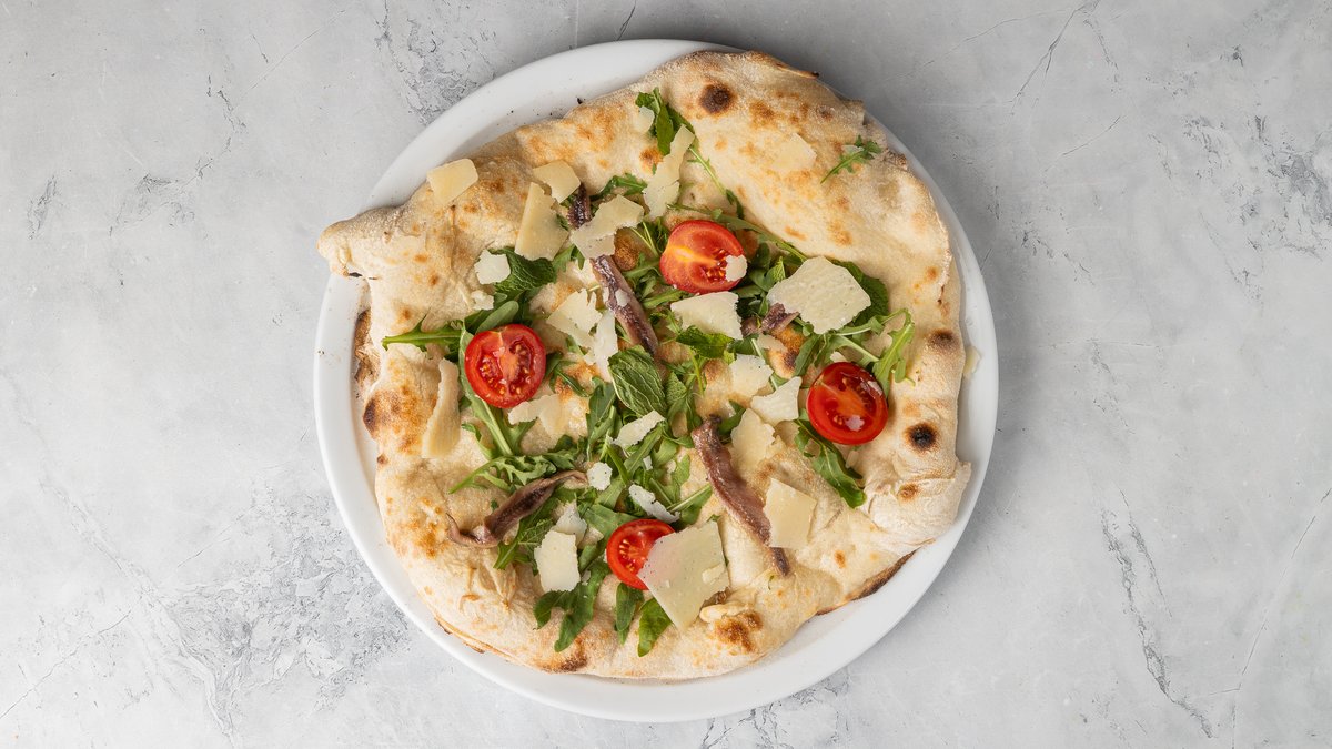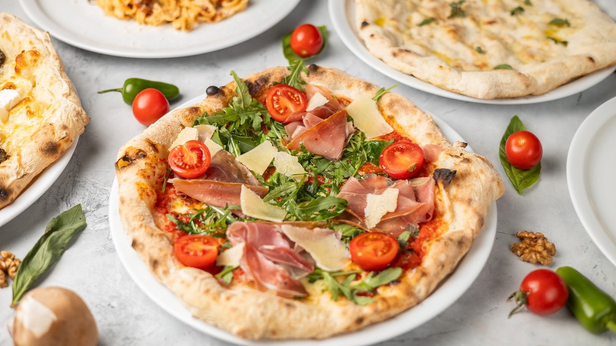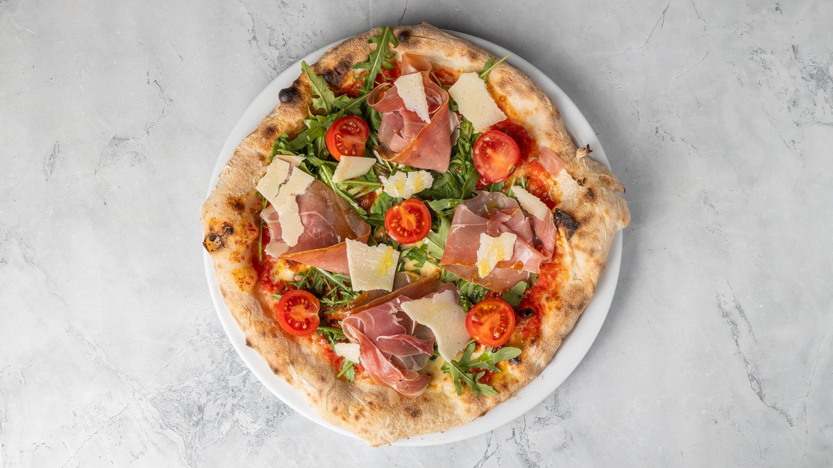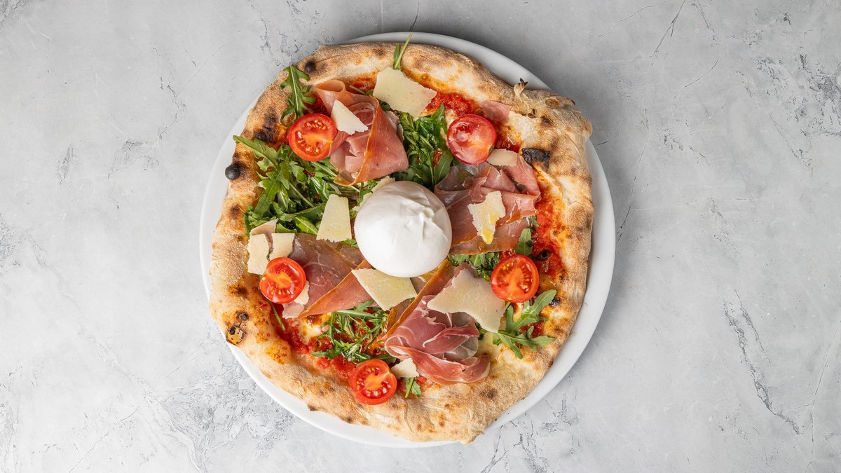 san marzano, fior di latte, pármai sonka, rukkola, koktélparadicsom, burrata, bazsalikom