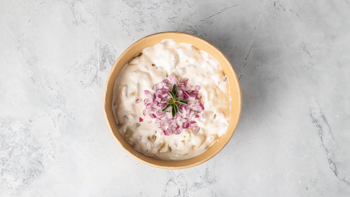 burgonya, lilahagyma, tejfölös alap (majonéz, mustár, citormlé)
