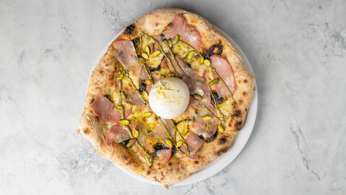 pisztáciakrém, fior di latte, mortadella, burrata, pisztáciamorzsa, baszalikom