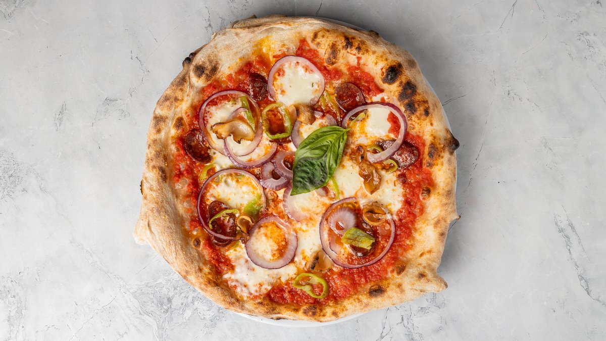 san marzano, fior di latte, hagyma mix, zöld paprika, házi kolbász, füstölt szalonna
