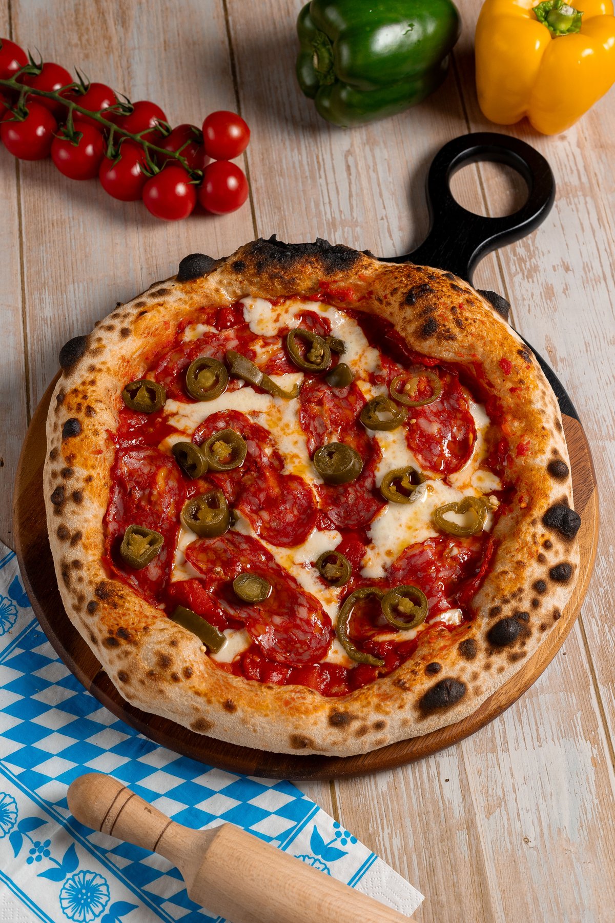 (tüzes paradicsomszósz, csípős szalámi, jalapeno és mozzarella)